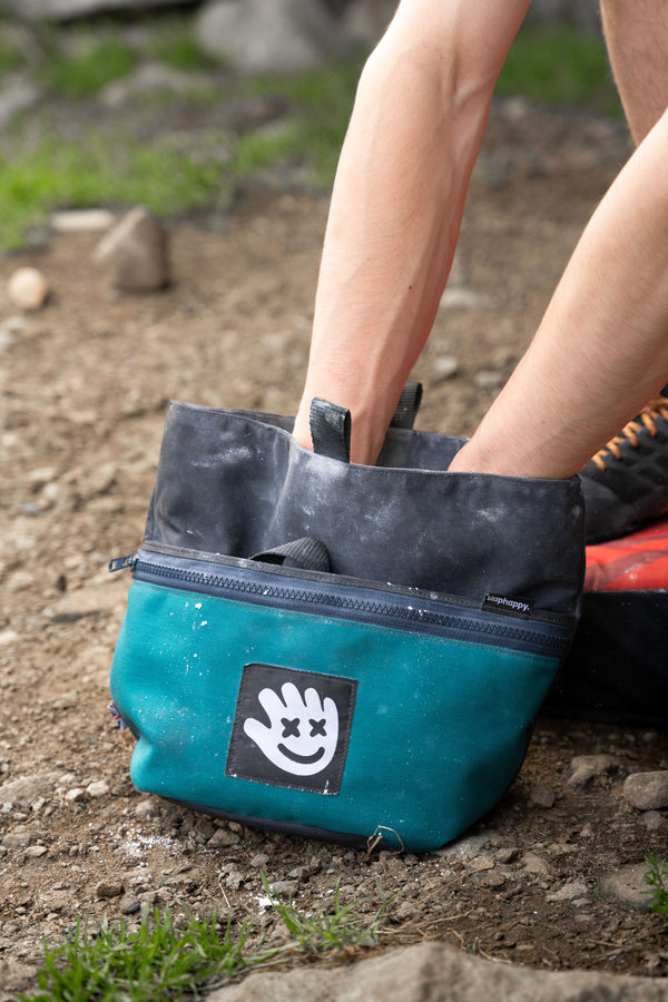 Made in our Lake District workshop in the UK, Slaphappy Original Boulder Bucket offers the same style, quality, and practical design as our bouldering pads and other gear. It features a magnetic closure, fold-down design, durable 1000D nylon exterior, and a 2.1-litre capacity, making it the perfect choice for the climbing gym, local boulders, or alpine crags.